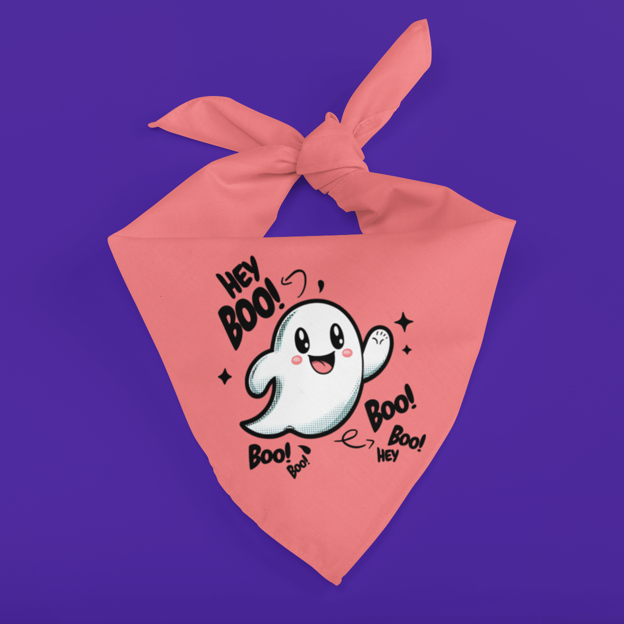 "Hey Boo! 👻 Dress your pup in style this Halloween with our 'HEY BOO' dog bandana! Perfect for spooky strolls and trick-or-treating fun. 🎃🐾 Shop now and let your furry friend steal the show this Halloween! 🧡🕸️ #HeyBoo #HalloweenDogs #SpookyStyle #DogCostume #FurryFrights #HalloweenDogApparel #ShopNow"